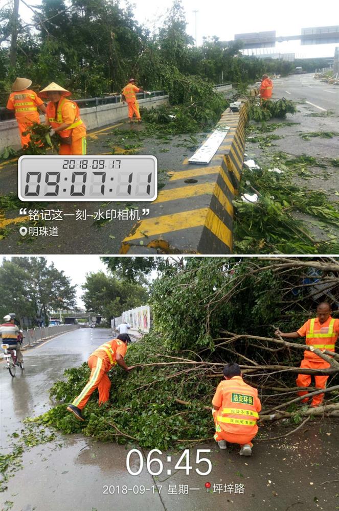 此次特大台风登陆前,太阳集团公司就作好了充分准备,组织快速抢险队伍、应急人员随时待命、各类应急车辆全部进入出发状态。在台风登陆时及时抢险,首先保证安全作业,台风过后,第一时间清理倒下来的大树,保证道路畅通,进行各种应急处置,然后清理树枝树叶及雨水篦子,应急清理路面垃圾,清运也同步进行,快速拉走路面大量树枝及落叶。 |